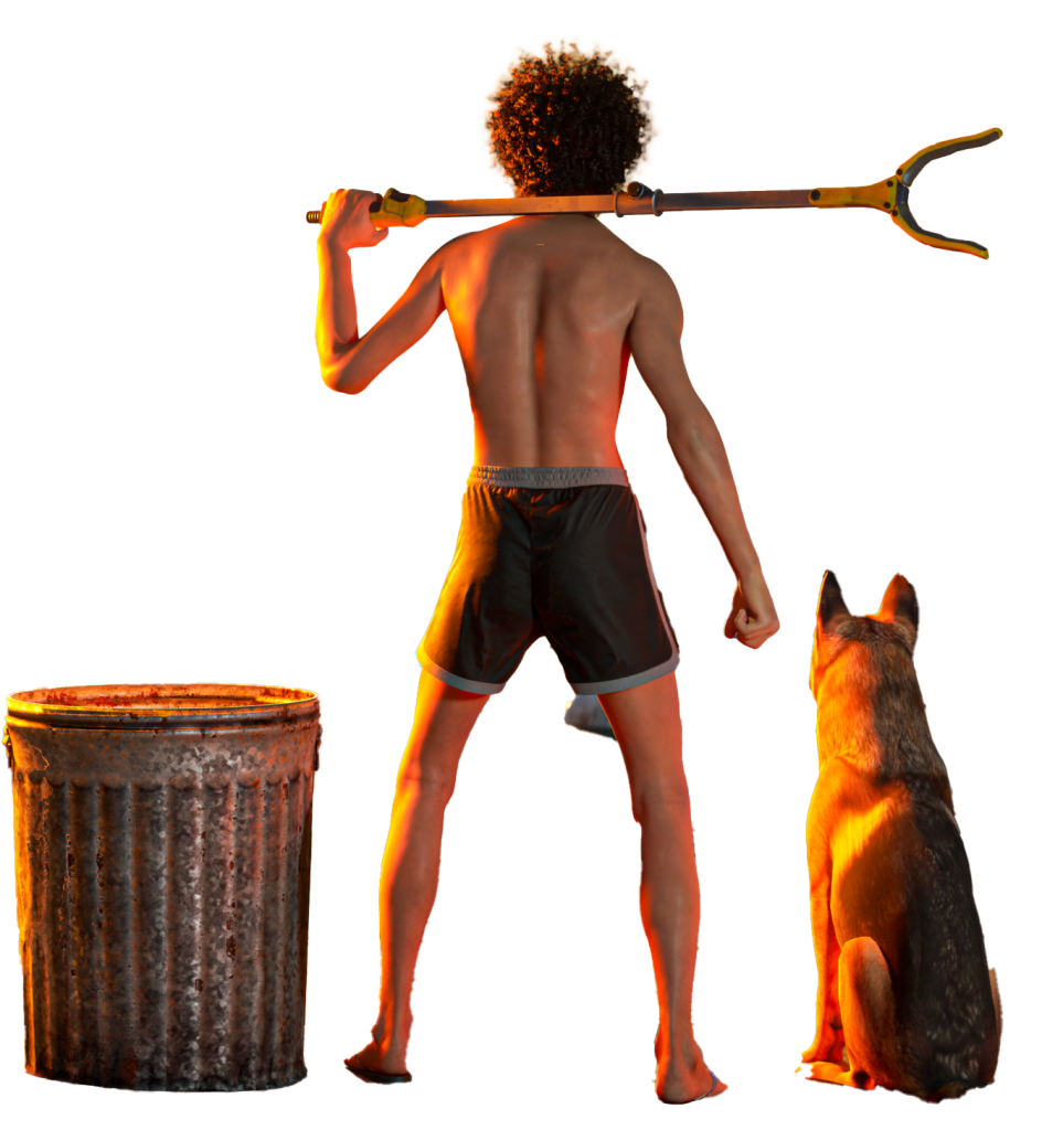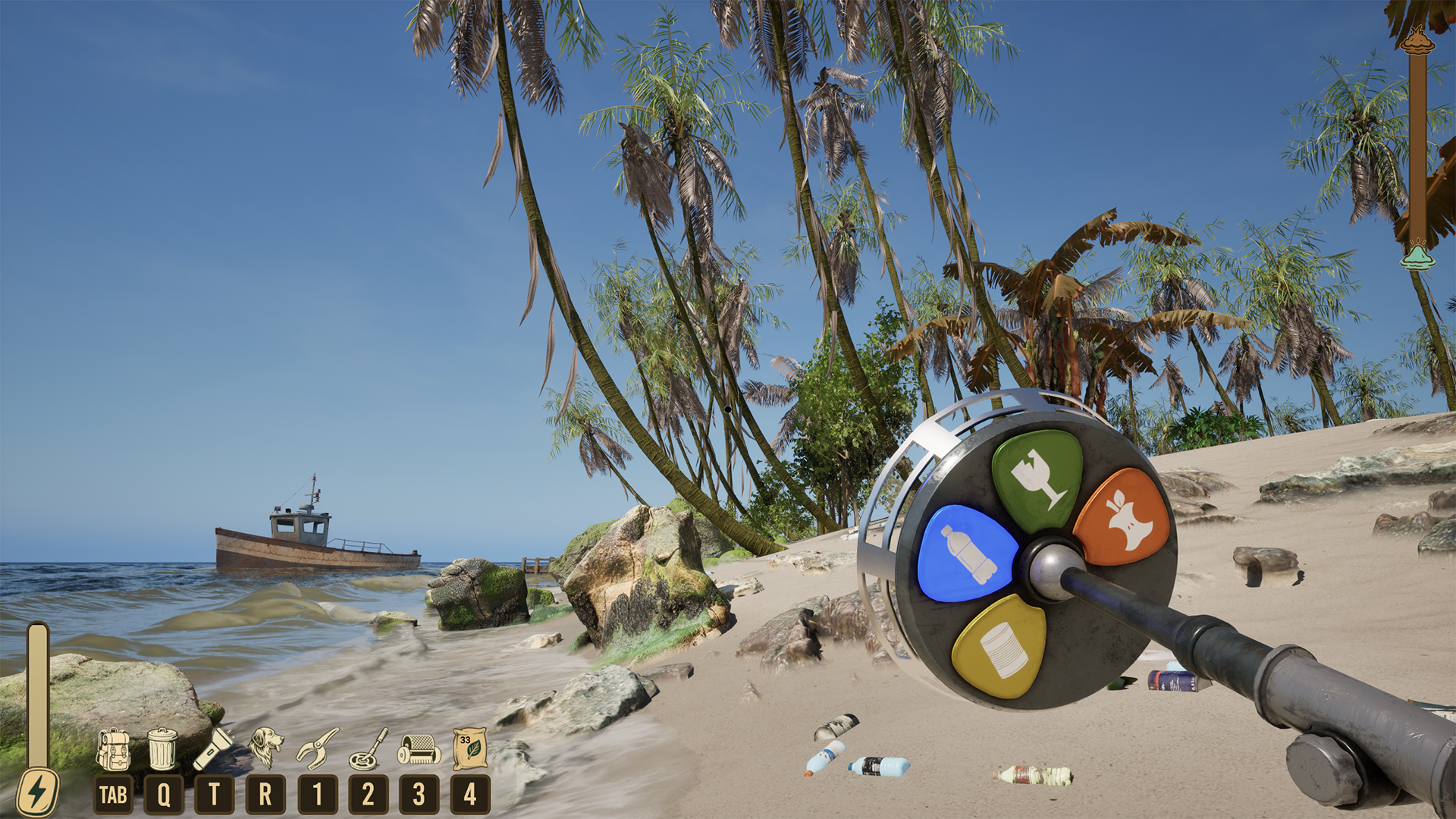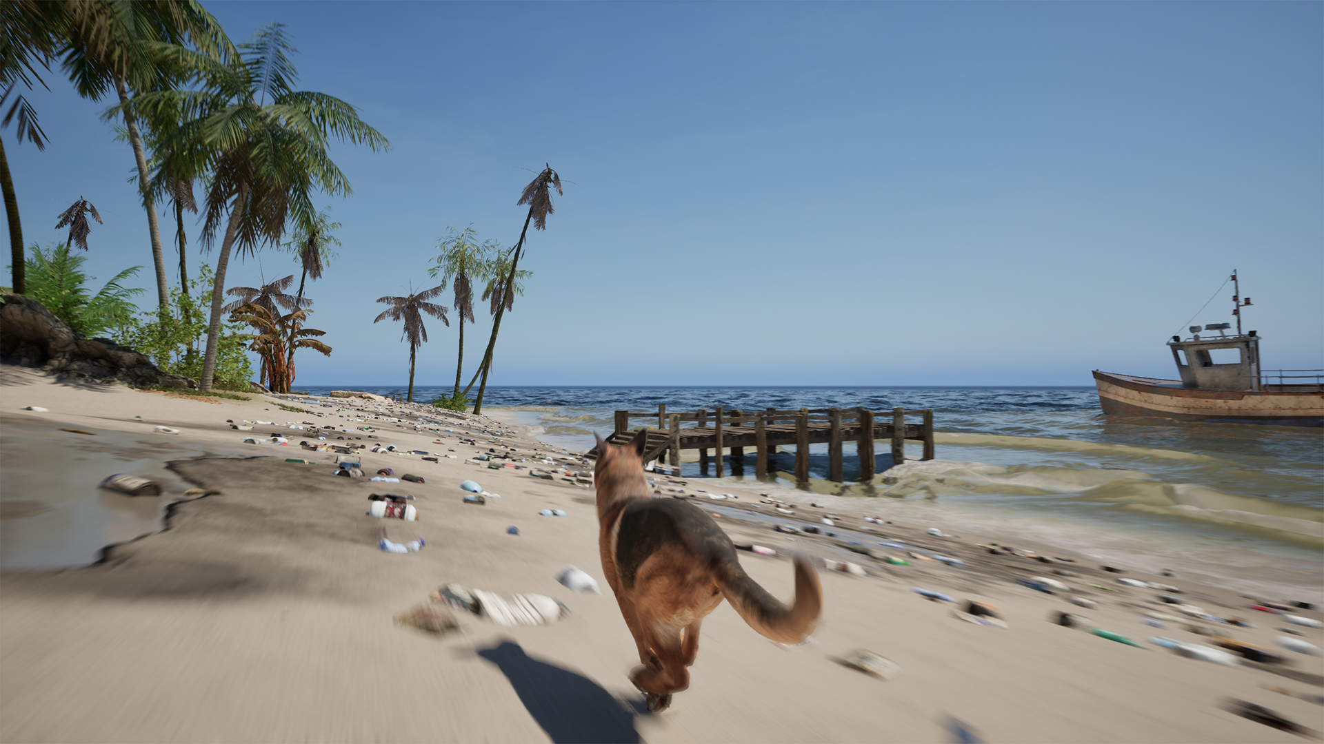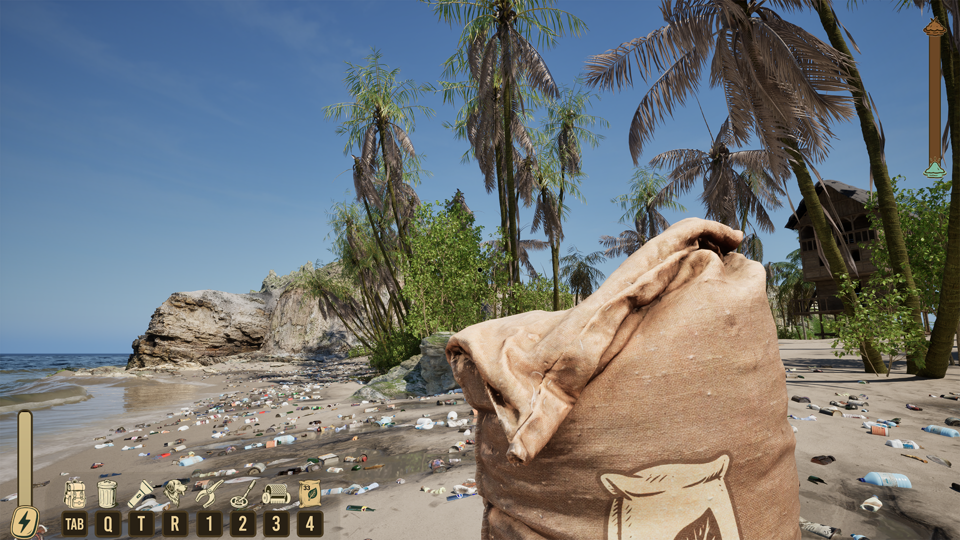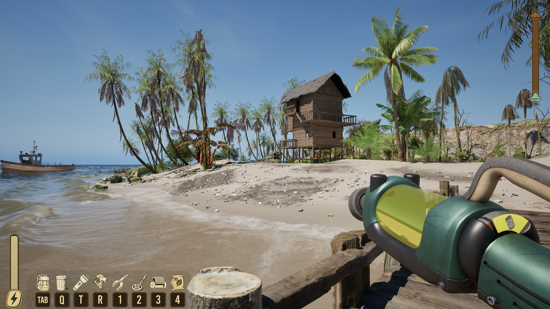 Realistic art style with warm, inviting lighting. Inspired by tropical islands, with before/after contrast. Highly detailed trash, foliage, and water effects in UE5.